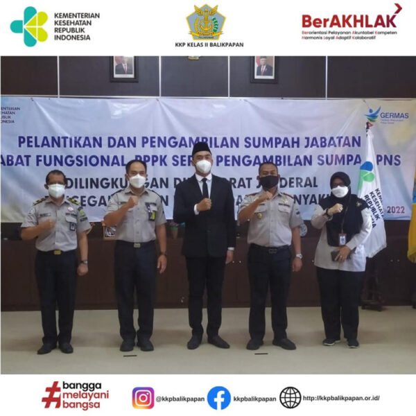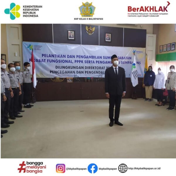 Balikpapan, 1 Maret 2022. Pelantikan dan Pengambilan Sumpah Jabatan, Pejabat Fungsional, PPPK Serta Pengambilan Sumpah PNS di Lingkungan Direktorat Jendral Pencegahan dan Pengendalian Penyakit. Pada Kantor Kesehatan Pelabuhan Kelas II Balikpapan Pegawai yang dilantik dan diambil sumpah yaitu Sofyan, SKM sebagai Pegawai Pemerintah dengan Perjanjian Kerja (PPPK)…
