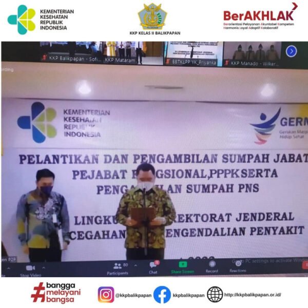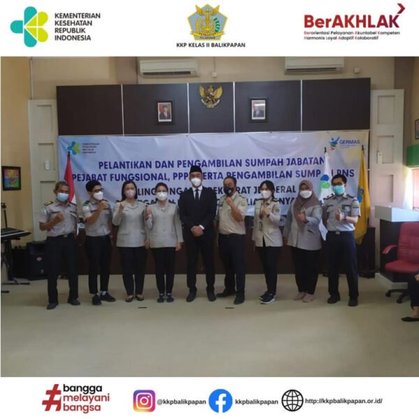 Balikpapan, 1 Maret 2022Pelantikan dan Pengambilan Sumpah Jabatan, Pejabat Fungsional, PPPK Serta Pengambilan Sumpah PNS di Lingkungan Direktorat Jendral Pencegahan dan Pengendalian Penyakit. Pada Kantor Kesehatan Pelabuhan Kelas II Balikpapan Pegawai yang dilantik dan diambil sumpah yaitu Sofyan, SKM sebagai Pegawai Pemerintah dengan Perjanjian Kerja (PPPK). Pengambilan sumpah dilakukan oleh Direktur Jenderal P2P Kementerian Kesehatan RI Dr. dr. Maxi Rein Rondonuwu, disaksikan oleh Kepala KKP Kelad II Balikpapan beserta para Pejabat Struktural. Pada kesempatan tersebut, bapak Direktur Jenderal P2P mengingatkan akan amanah yang baru saja diberikan untuk selalu dilaksanakan dengan baik dan penuh tanggung jawab. Beliau juga mengingatkan bahwa di Lingkungan Direktorat Jenderal P2P cukup berat, sehingga diharapkan untuk tetap menjaga kesehatan dan pola makan agar dapat memberikan pelayanan yang baik kepada Masyarakat.