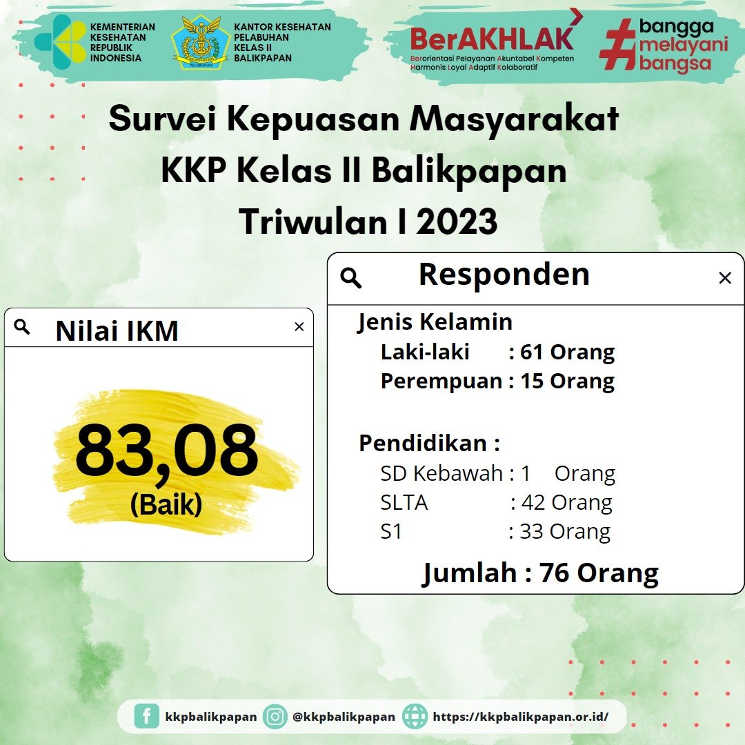 Berikut adalah Laporan Survey Kepuasan Masyarakat terhadap layanan yang dilakukan pada periode I tahun 2023 di Kantor Kesehatan Pelabuhan Kelas II Balikpapan