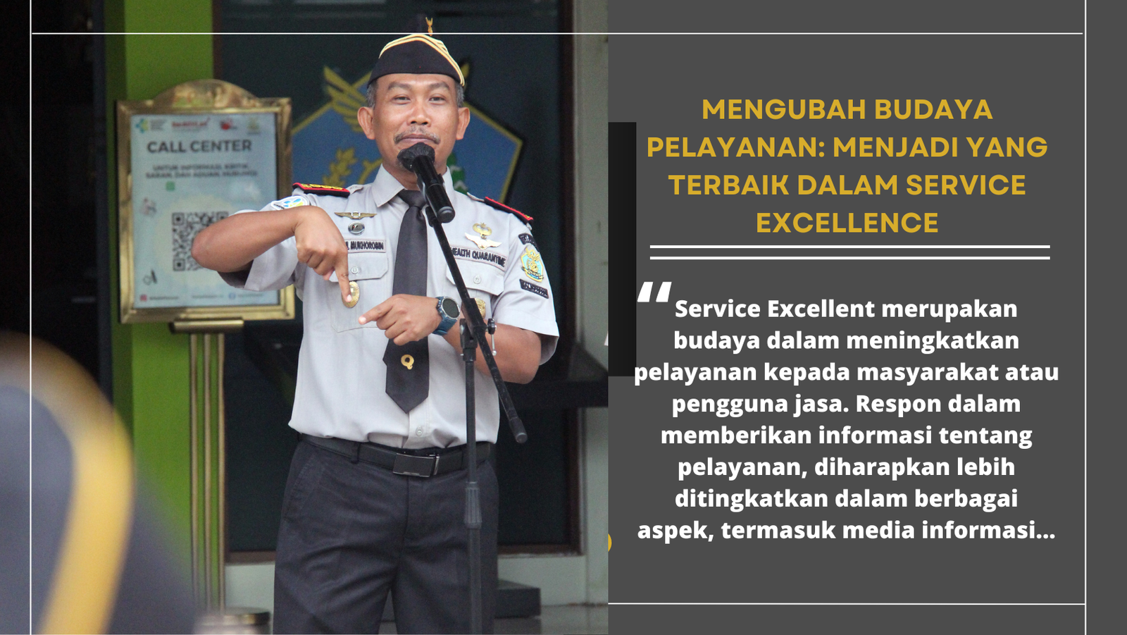 Dalam arahannya Kepala KKP Kelas II Balikpapan, dr. M. Zainul Mukhorobin, MMRS, menyampaikan, “Service Excellent merupakan budaya dalam meningkatkan pelayanan kepada masyarakat atau pengguna jasa. Respon dalam memberikan informasi tentang pelayanan, diharapkan lebih ditingkatkan dalam berbagai aspek, termasuk media informasi. Pengguna layanan ini (konsumen), bukan hanya dari pengguna jasa tetapi dari internal, sehingga diharapkan peran dari semua pegawai dapat saling berkontribusi dalam membangun sistem pelayanan yang lebih baik lagi”.