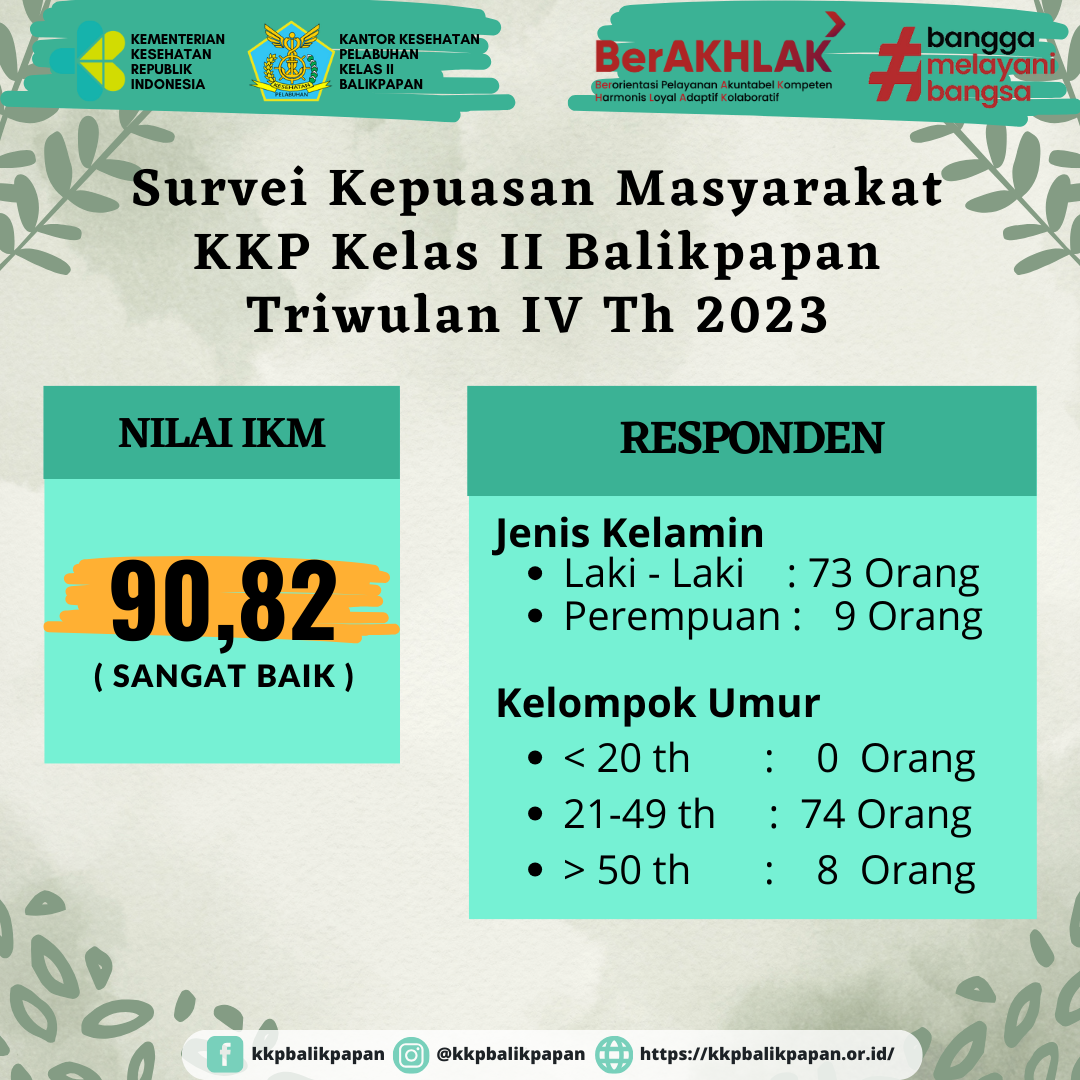 Berikut merupakan Laporan Survei Kepuasan Masyarakat pada periode triwulan IV tahun 2023 di Kantor Keshatan Pelabuhan Kelas II Balikpapan