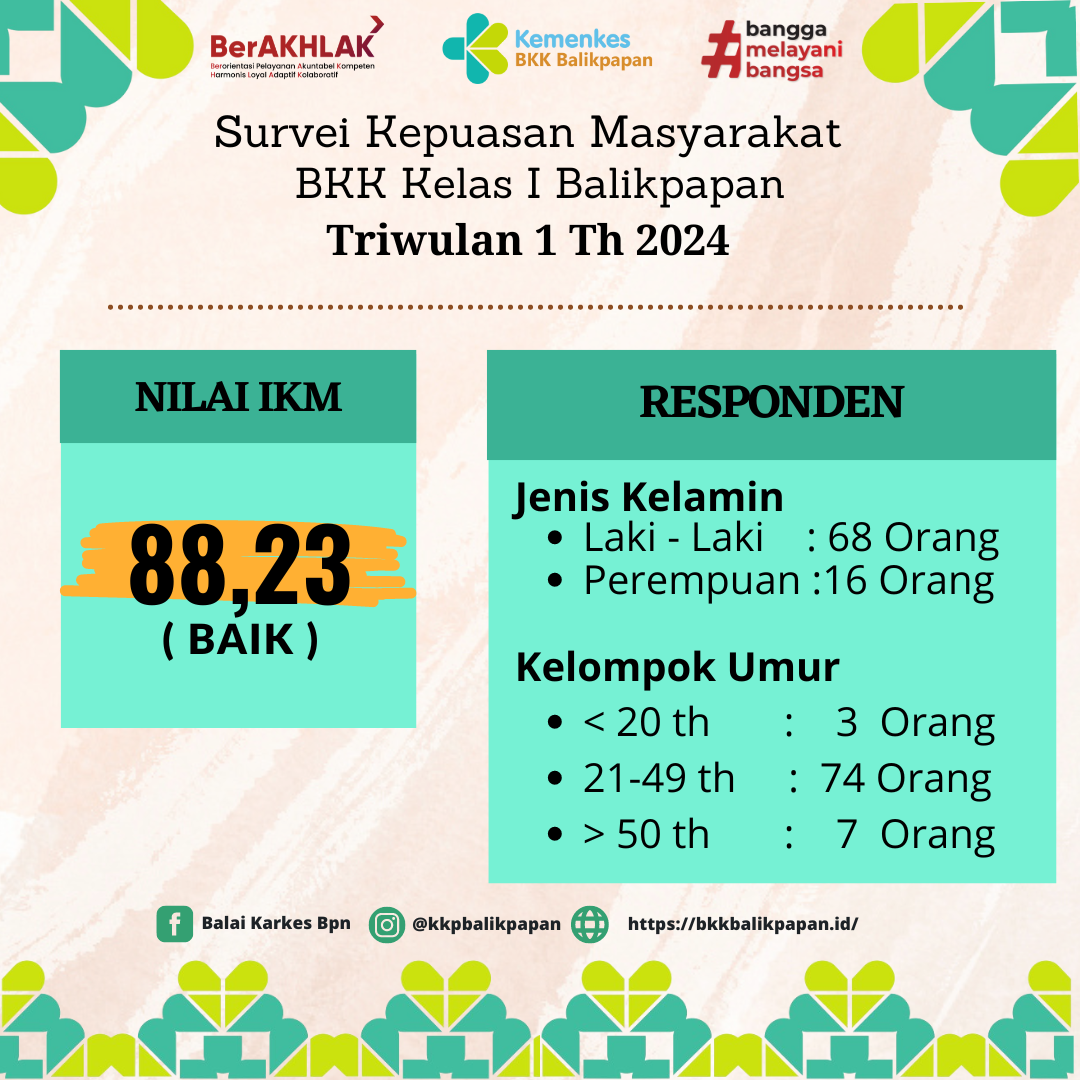 Berikut merupakan Laporan Survei Kepuasan Masyarakat pada periode triwulan I tahun 2024 di Balai Kekarantinaan Kesehatan Kelas I Balikpapan