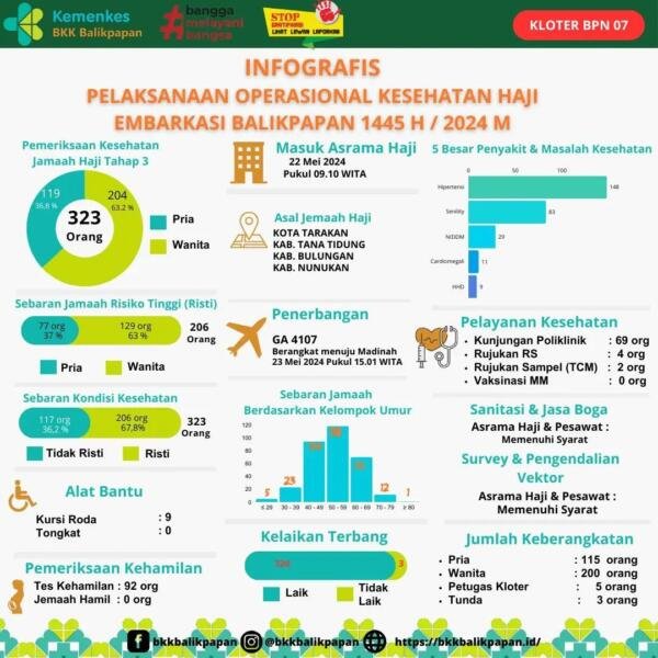 Berikut kami sajikan data infografis pelaksanaan operasional kesehatan haji Embarkasi Balikpapan 2024 M /1445 H untuk Kloter 7