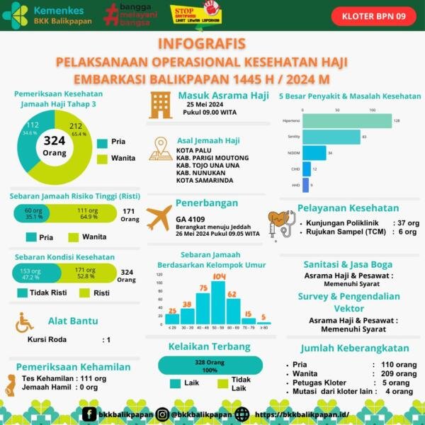 Berikut kami sajikan data infografis pelaksanaan operasional kesehatan haji Embarkasi Balikpapan 2024 M /1445 H untuk Kloter 9