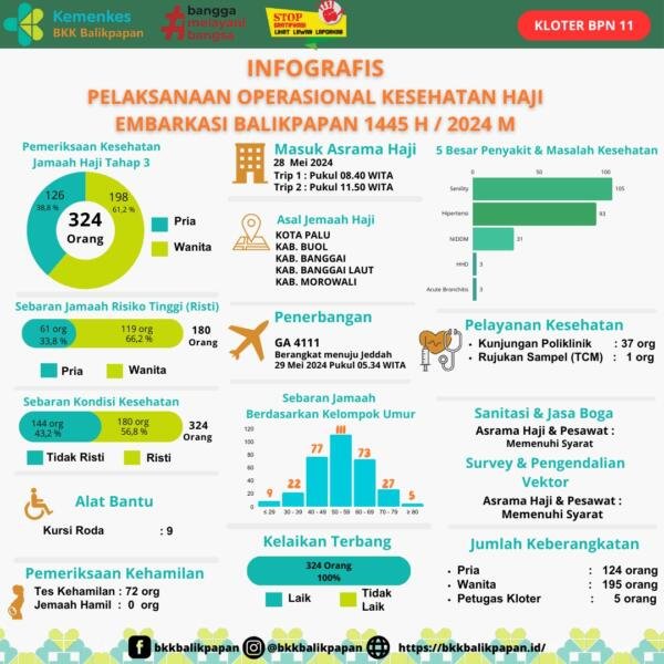Berikut kami sajikan data infografis pelaksanaan operasional kesehatan haji Embarkasi Balikpapan 2024 M /1445 H untuk Kloter 11