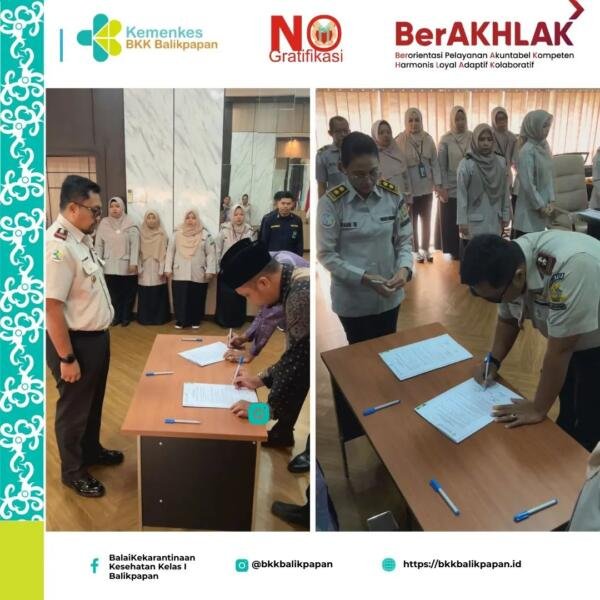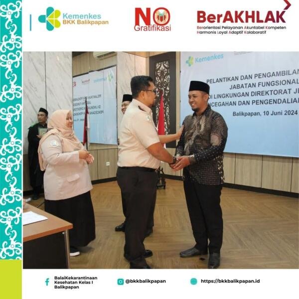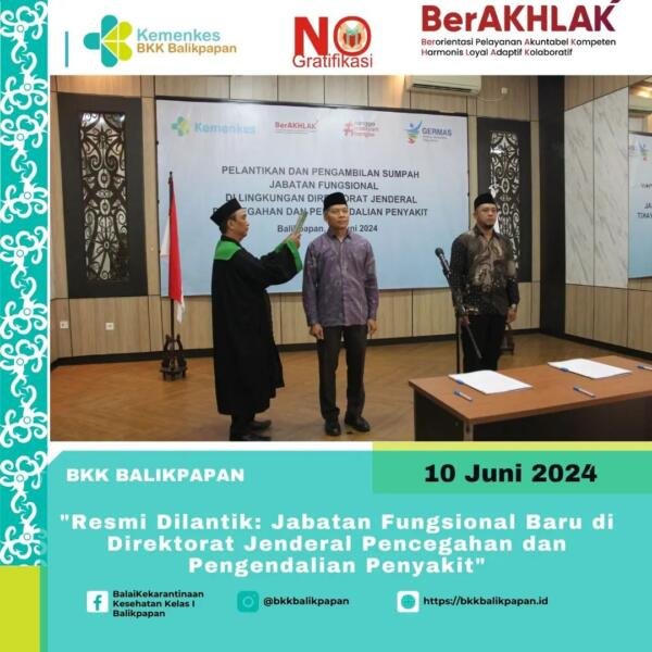 Balikpapan, – 10 Juni 2024 Balai Kekarantinaan Kesehatan Kelas I Balikpapan, melantik dan mengambil sumpah Pegawai Negeri Sipil dengan Jabatan Fungsional baru an dr.Taufik Kukuh Widodo, M.Ked.Trop sebagai Dokter Ahli Pertama, dan Hendrie Prasetiya, SKM sebagai Sanitarian Ahli Pertama.