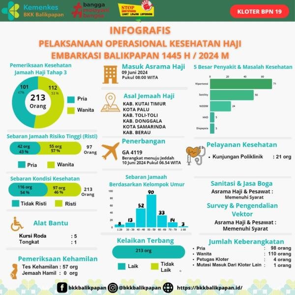 Berikut kami sajikan data infografis pelaksanaan operasional kesehatan haji Embarkasi Balikpapan 2024 M /1445 H untuk Kloter 19