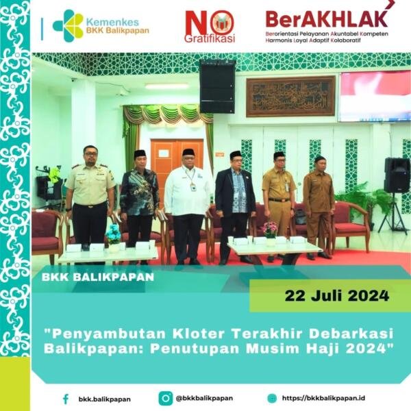 Balikpapan, 22 Juli 2024 – Kloter terakhir jemaah haji Debarkasi Balikpapan, Kloter 19, tiba dengan selamat di Bandara Internasional Sultan Aji Muhammad Sulaiman Sepinggan pada musim haji tahun 2024 M/1445 H. Penyambutan berlangsung khidmat dengan kehadiran pejabat daerah, keluarga jemaah, serta masyarakat setempat. Tercatat jemaah Kloter 19 yang tiba berjumlah 204 orang dengan rincian 197 jemaah haji, 1 orang TPHI, 1 orang TPIHI dan 3 orang TKHI.