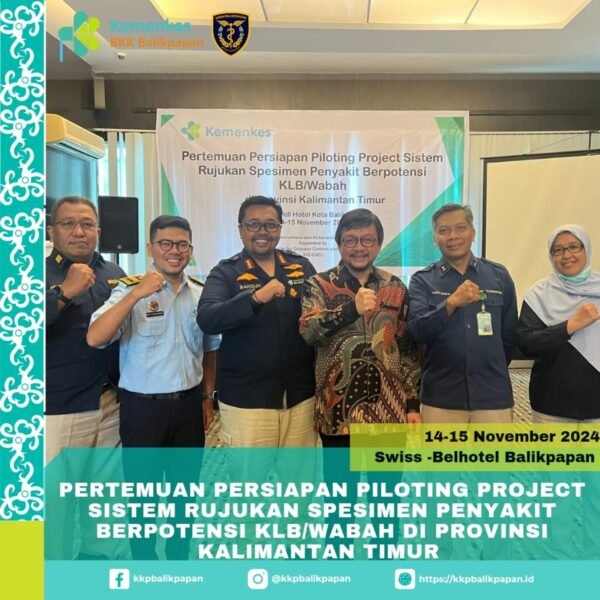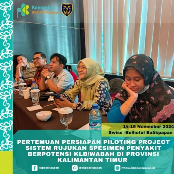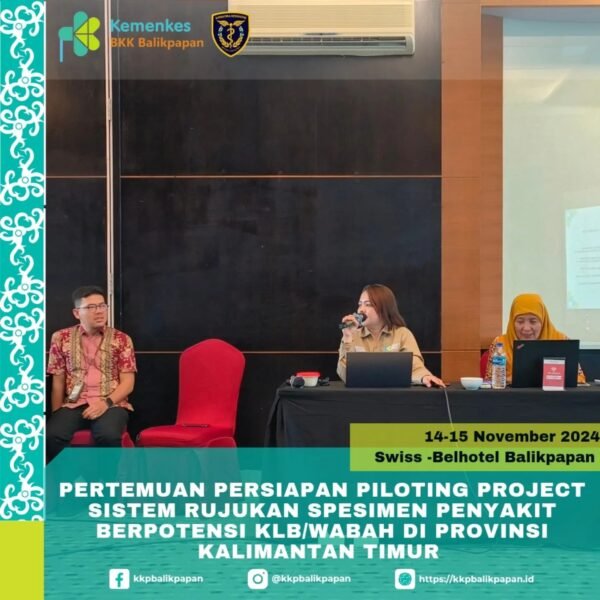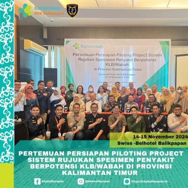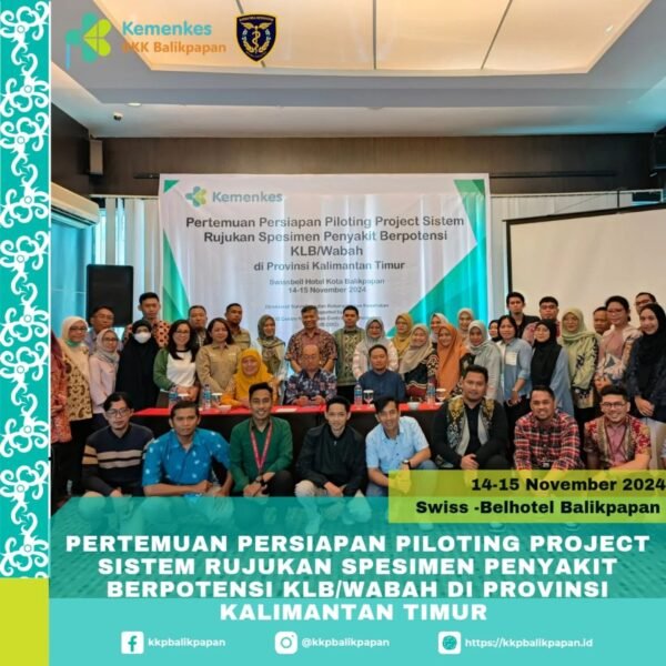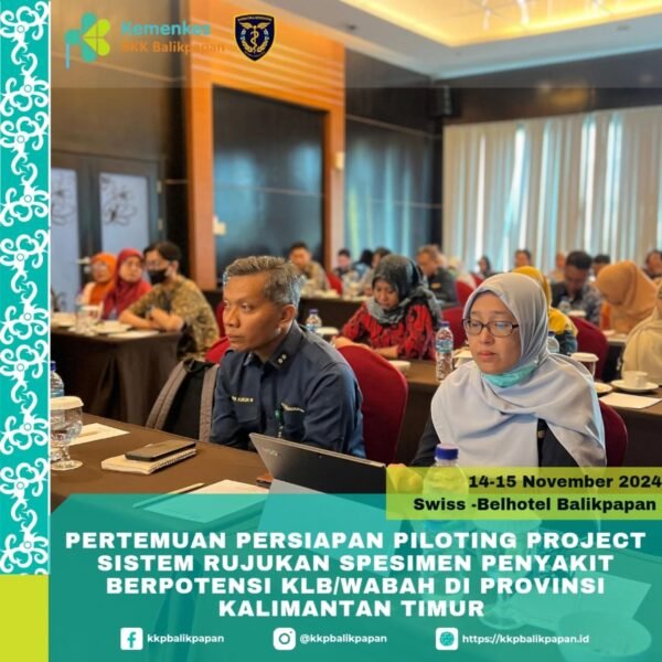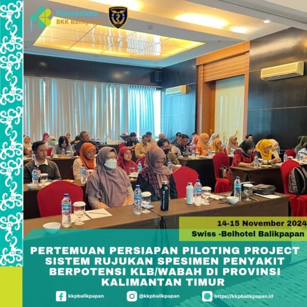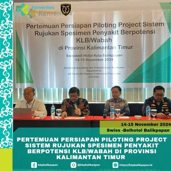 Balikpapan 14-15 November 2024. Kementerian Kesehatan mengadakan pertemuan Persiapan Piloting Project Sistem Rujukan Spesimen Penyakit Berpotensi KLB / Wabah di Provinsi Kalimantan Timur.