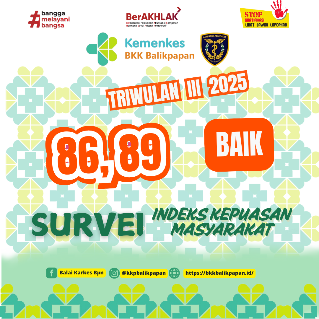 Berikut merupakan Laporan Survei Kepuasan Masyarakat pada periode triwulan III tahun 2025 di Balai Kekarantinaan Kesehatan Kelas I Balikpapan